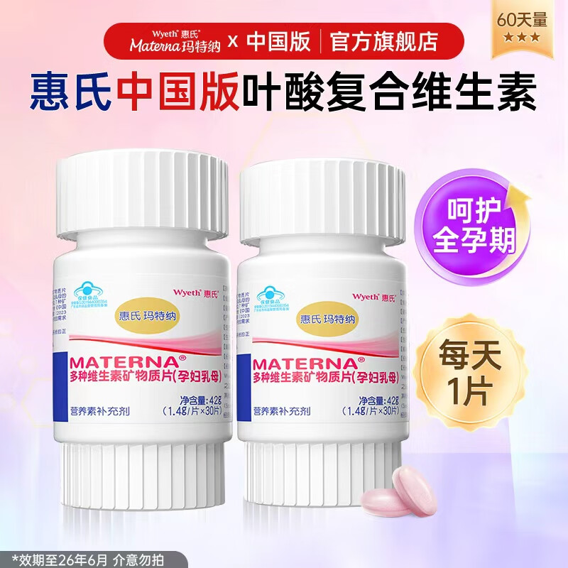 玛特纳惠氏中国版孕妇复合维生素补充叶酸钙铁锌硒20种营养素 【孕产妇多种维生素60天量】30片*2瓶