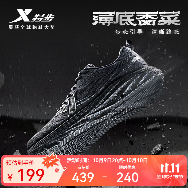 特步薄底香菜男跑鞋新款减震回弹耐磨轻盈宽楦鞋通勤运动休闲鞋 黑 42