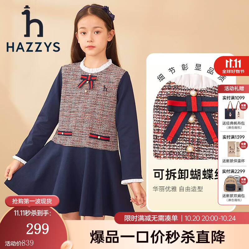 哈吉斯(HAZZYS)品牌童装儿童女童秋新款连衣裙简约学院风拼接连衣裙 格 145