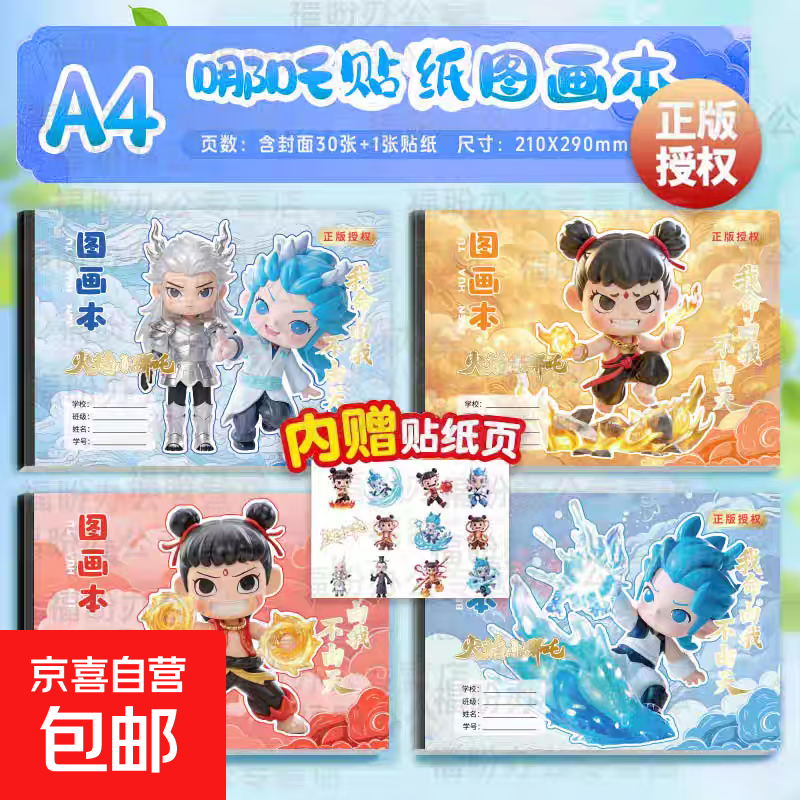 新款火焰小哪吒图画本带贴纸A4加厚儿童画画本幼儿园涂鸦本儿童画画本绘画本小学生美术本马克笔 升级款/带贴纸【火焰哪吒-1本随机】
