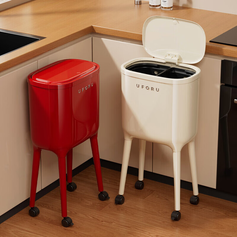 纳份爱厨房高脚垃圾桶干湿分离免弯腰家用大号2026新款大容量夹缝垃圾桶 12L 中号 墨绿色【内外双桶/带轮可移动】