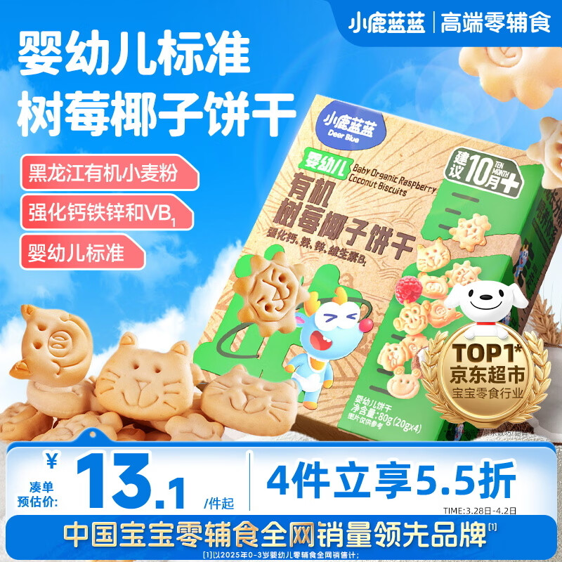 小鹿蓝蓝婴幼儿有机树莓椰子饼干 宝宝零食有机饼干淡口味9种动物造型80g