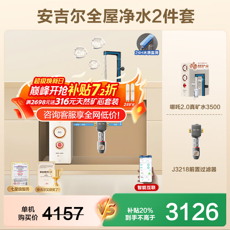 安吉尔【官方直营】净水器家用直饮 哪吒2.0真矿水3500 反渗透RO膜过滤器1400G流速套装加热矿物质净水机 【全屋净水2件套装】净水器+过滤器