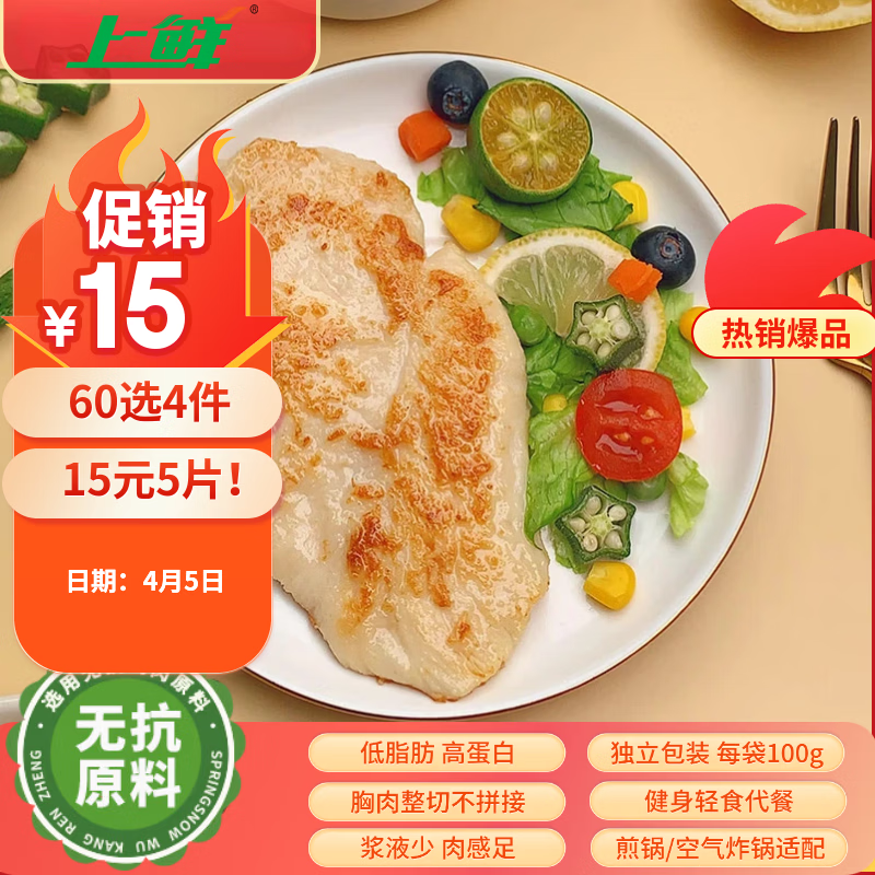 上鲜香煎鸡排100g*5片低脂鸡胸肉汉堡伴侣 儿童早餐健身代餐轻食餐