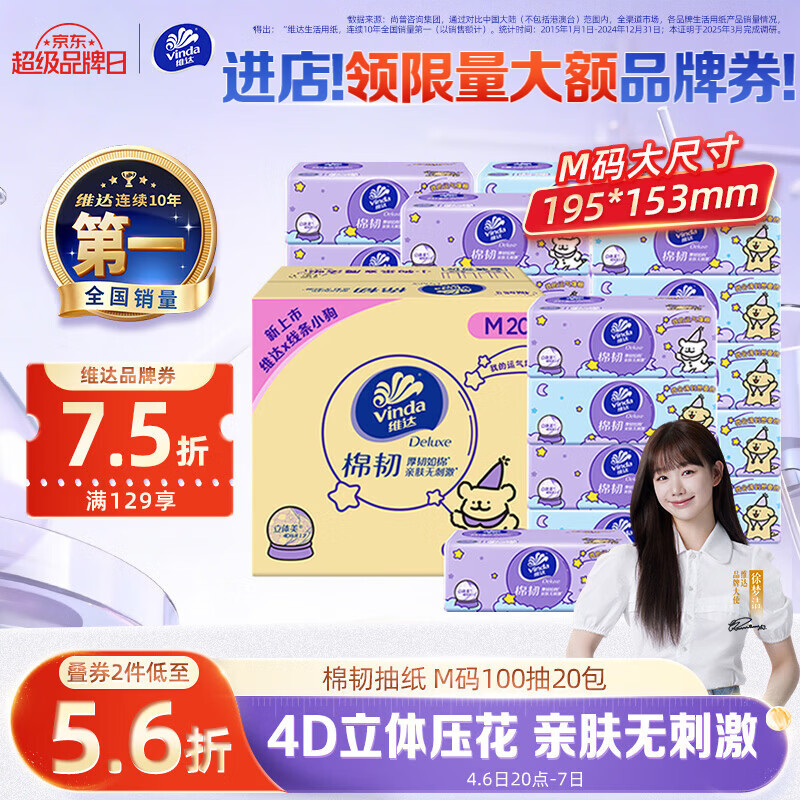 维达(Vinda)抽纸 棉韧3层100抽*20包M码 线条小狗联名 纸巾卫生纸 整箱