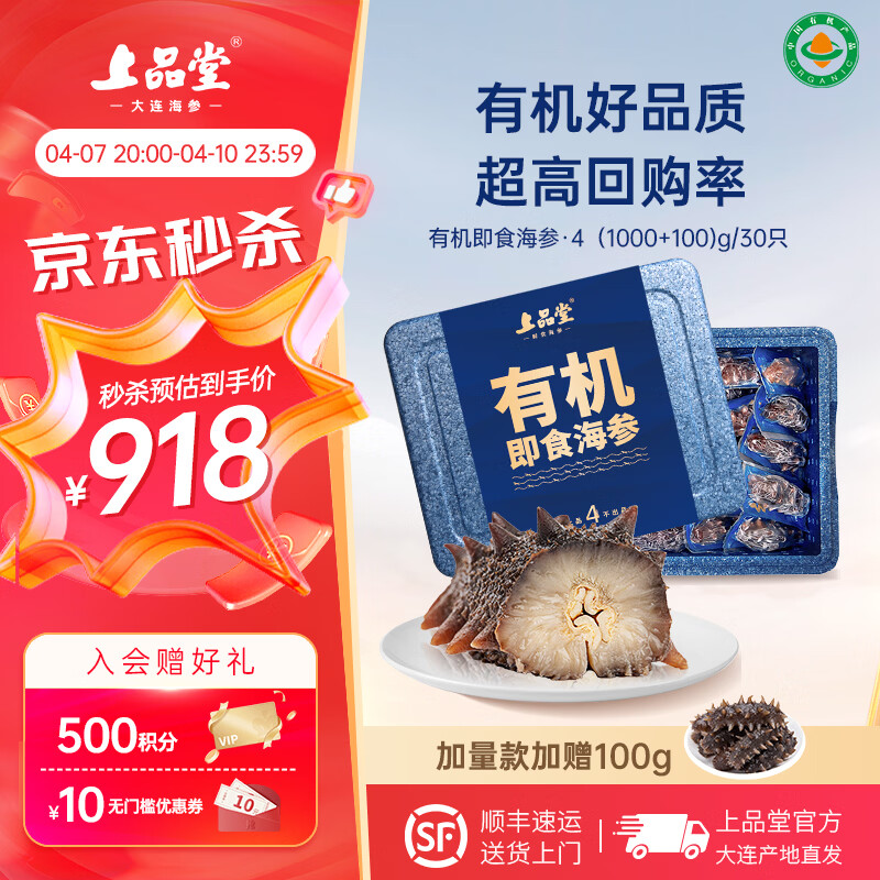 上品堂 大连有机即食海参 高品质辽刺参固形物≥85%单个装生鲜送礼礼盒 1100g /30只礼盒【高回购】