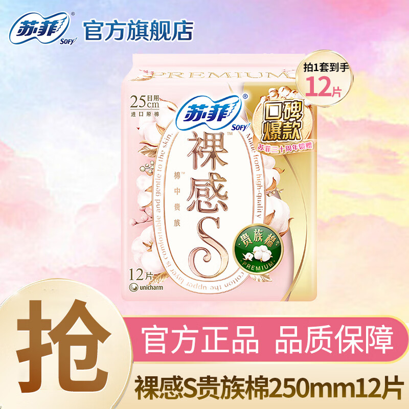 苏菲Sofy裸感S原棉柔软贵族棉系列量乳木果多日用极薄卫生巾 裸感s250mm12片