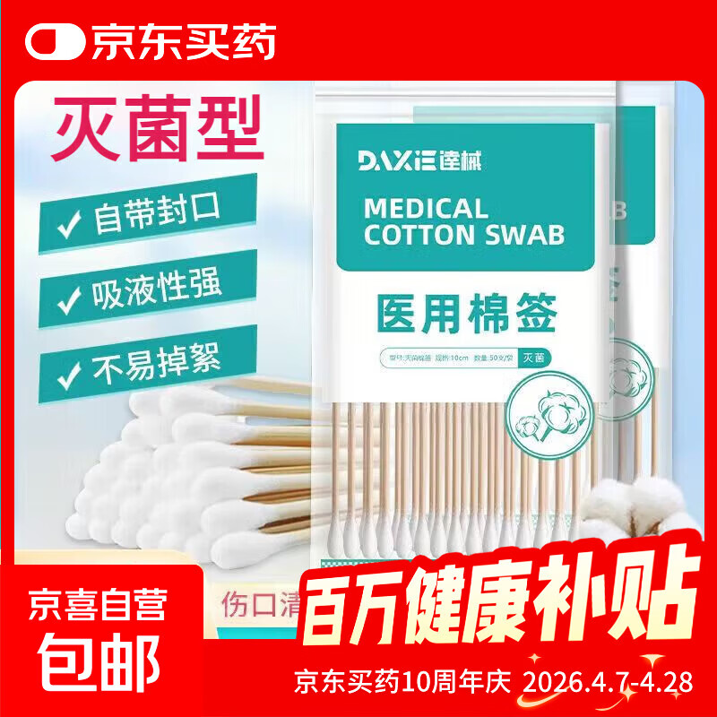 无菌一次性医用棉花头棉签单头便捷伤口清洁消毒家用掏耳棉棒 10cm医用棉签(50支/包)*2