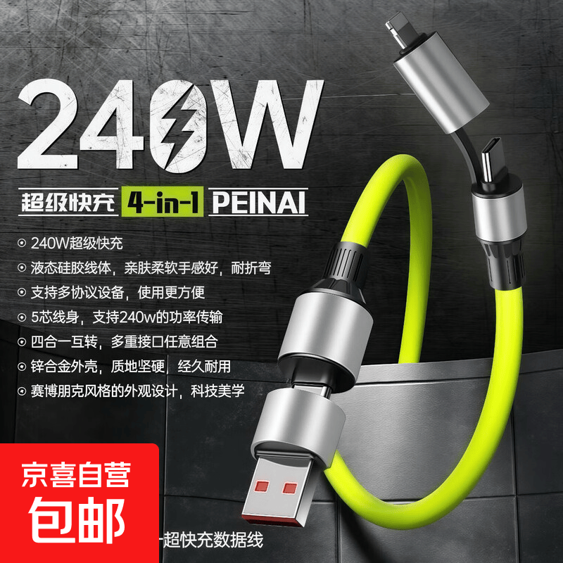 四合一超级快充数据线适用安卓type-c通用车载二拖二充电线适用华为三星小米苹果15/16/17手机平板 绿色【1.5米】