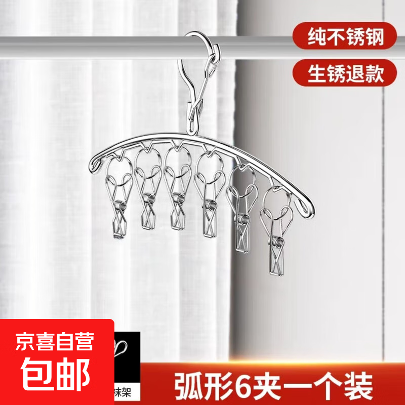 不锈钢袜子夹晾衣架防风弧形家用收纳晾晒衣架晒挂架 防风弧形6夹【1个装】