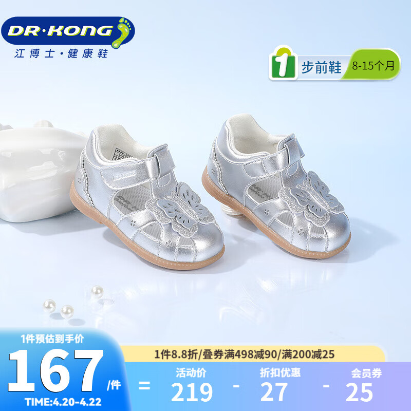 江博士夏季女童百搭透气步前鞋 宝宝学步可爱公主包头儿童凉鞋 银色 19 脚长约10.9-11.5