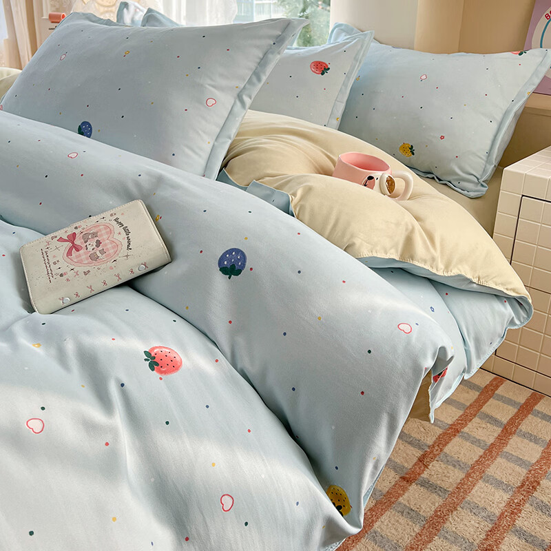 软贝小清新四件套 透气亲肤印花卡通简约田园风被套床单款套件 奶油草莓 2.0m 床单款 四件套(被套200*230cm)