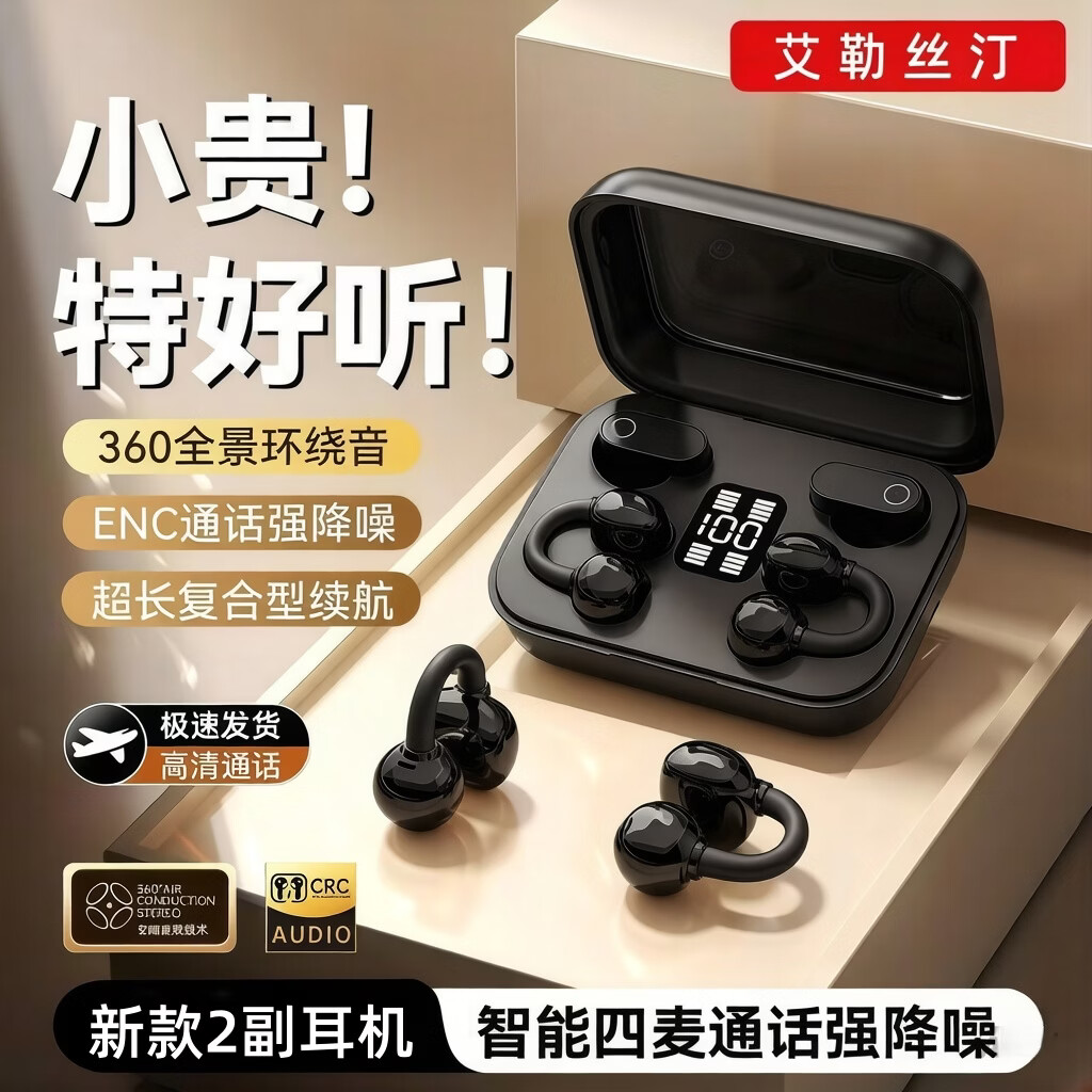 艾勒丝汀【2026新款丨两副耳机】蓝牙耳机无线耳夹式骨传导概念双耳半入耳二合一通话降噪超长续航跑步运动 【石墨黑丨高保真Ultra版】2副耳机 影院级IMAX音效丨钛丝技术3.0丨Ai双重防漏