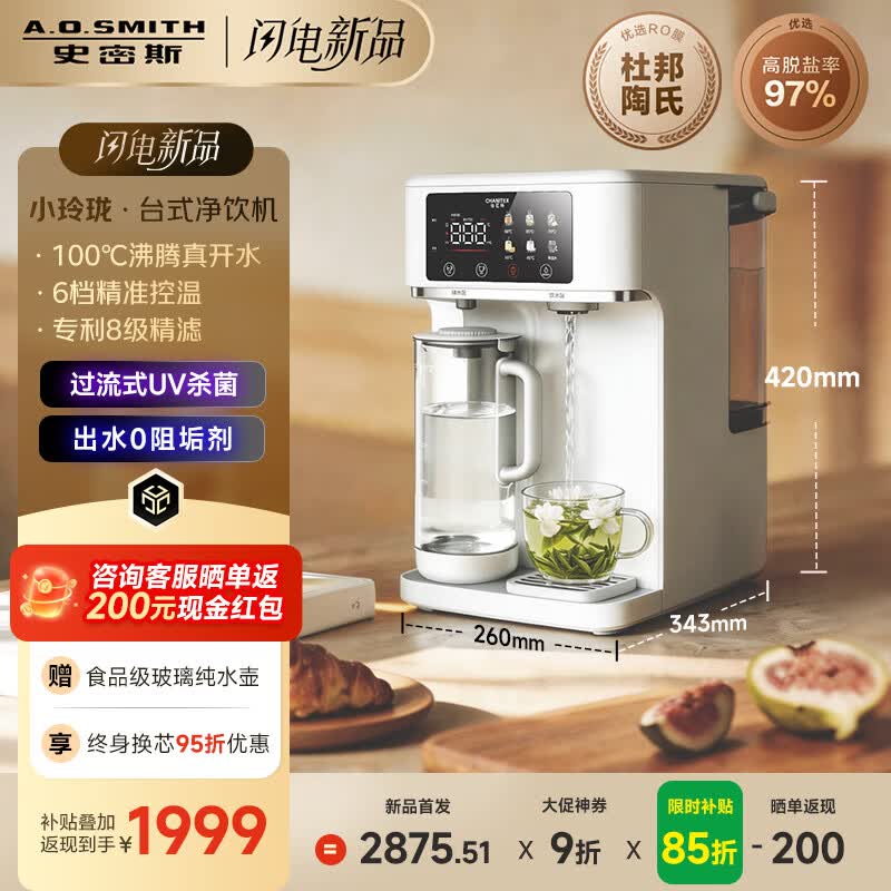 史密斯(A.O.SMITH)【2026上新】佳尼特小玲珑家用免安装台式净饮机 RO反渗透即热净水机净水器加热直饮一体机CR260H2 纯粹0添加 玲珑不占地 5L 6档控温8级精滤